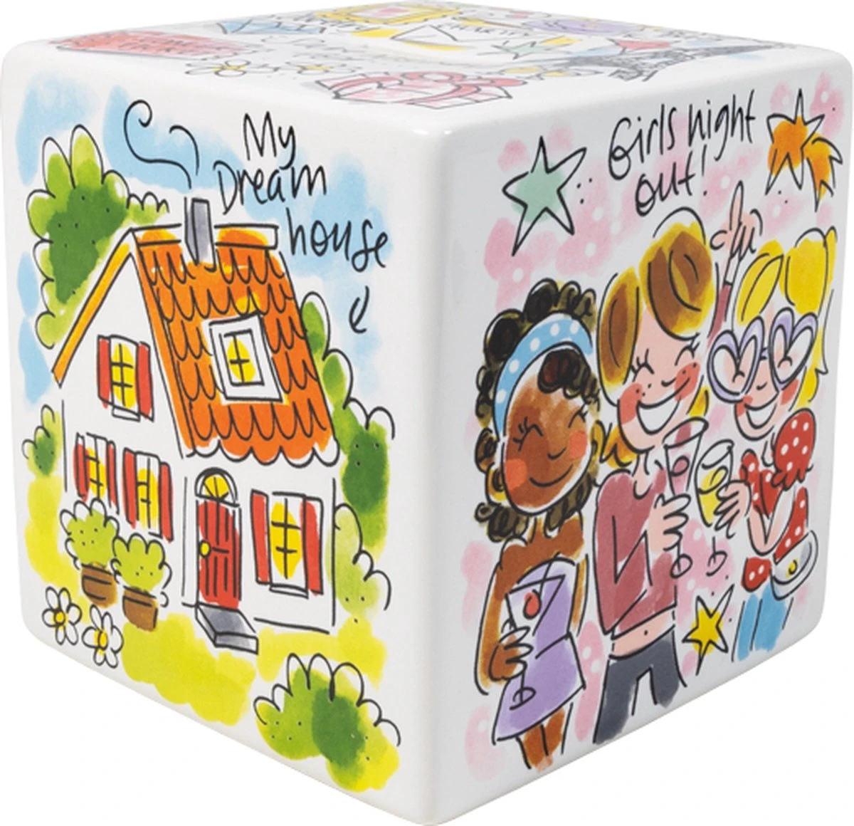 De collectie Even Bijkletsen is nog steeds de grote favoriet van vele Blond-liefhebbers. Nieuw in deze collectie is de vierkante spaarpot. Spaar nu voor een dagje shopje, een avondje uit of je droomhuis :-). Met de vrolijke tekeningen en quotes op de spaarpot, wordt sparen geen probleem!