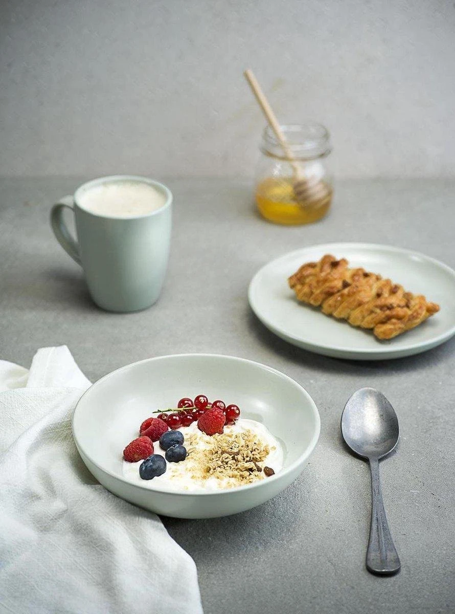 Waar het Viva servies op tafel staat, voelt iedereen zich meteen thuis. De borden en bekers hebben een zacht en rustig karakter dankzij de eenvoudige vormen, de afgeronde dikke randen, de zijdezachte matte afwerking en de drie verschillende zachte kleuren, die allemaal heel mooi samen passen. Het hele servies is gemaakt uit extra dik aardewerk, perfect voor het dagelijkse leven dus. Deze set bestaat uit vier platte borden, vier diepe borden, vier dessertborden en vier mokken.