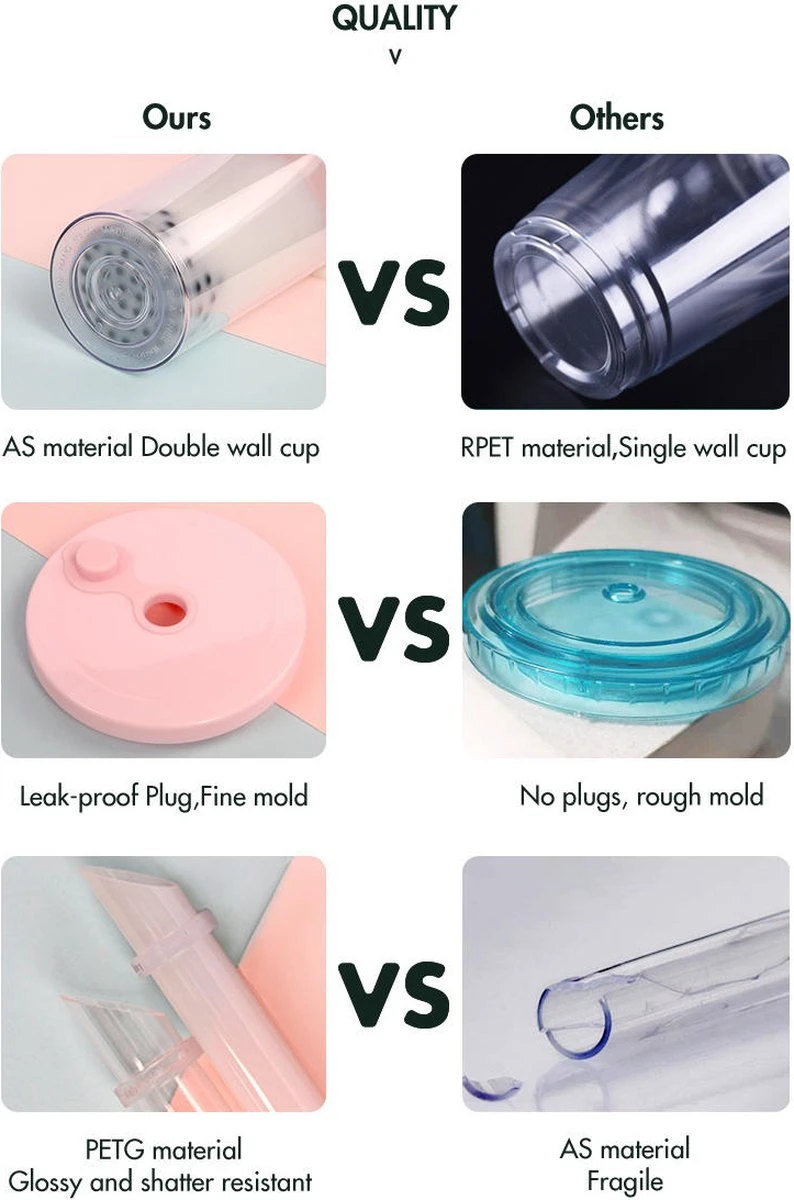 Drink altijd en overal je drankjes met deze herbruikbare drinkbeker. Door de grotere omvang van het rietje drink je gemakkelijk verschillende soorten drankjes, zoals smoothies, milkshakes en bubble tea. De drinkbeker heeft een inhoud van 550ml. Dit is voor de meeste de ideale hoeveelheid, niet te groot en niet te klein. De dubbele wand zorgt voor goede isolatie, hierdoor blijft je drankje koud of warm. De drank is afgelsoten en wanneer je de beker per ongeluk omvalt komt er alleen vloeistof door het rietje naar buiten. Daarnaast kan het rietje er ook uit worden gehaald en met de vastzittende silicone plug kan de deksel volledig worden afgesloten.