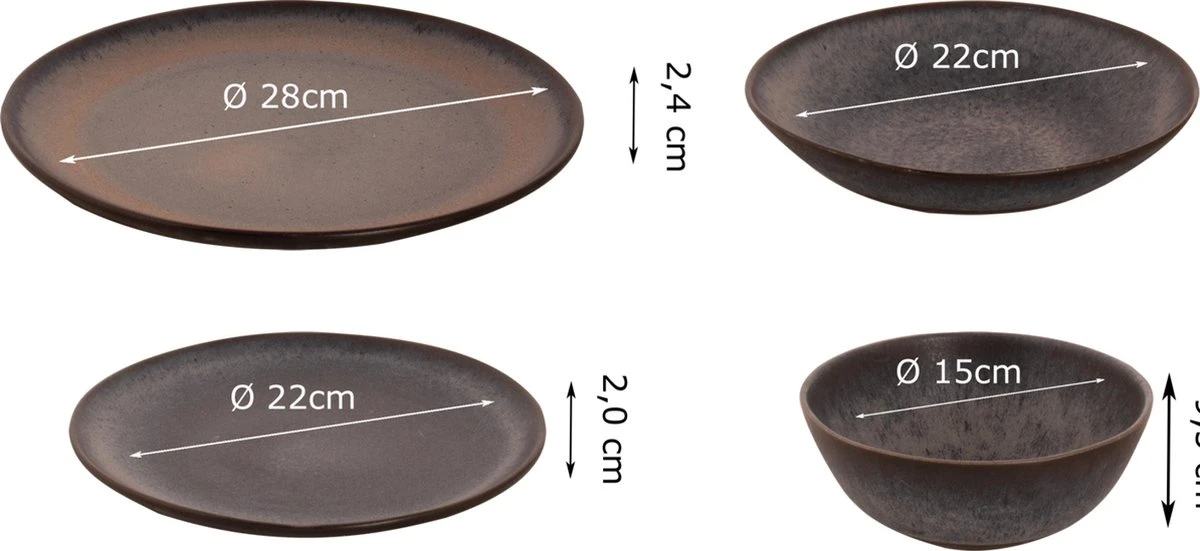 · Product: 6 dinerborden 28 cm, 6 ontbijtborden 22 cm, 6 diepe (pasta)borden 22 cm en 6 schalen 15 cm